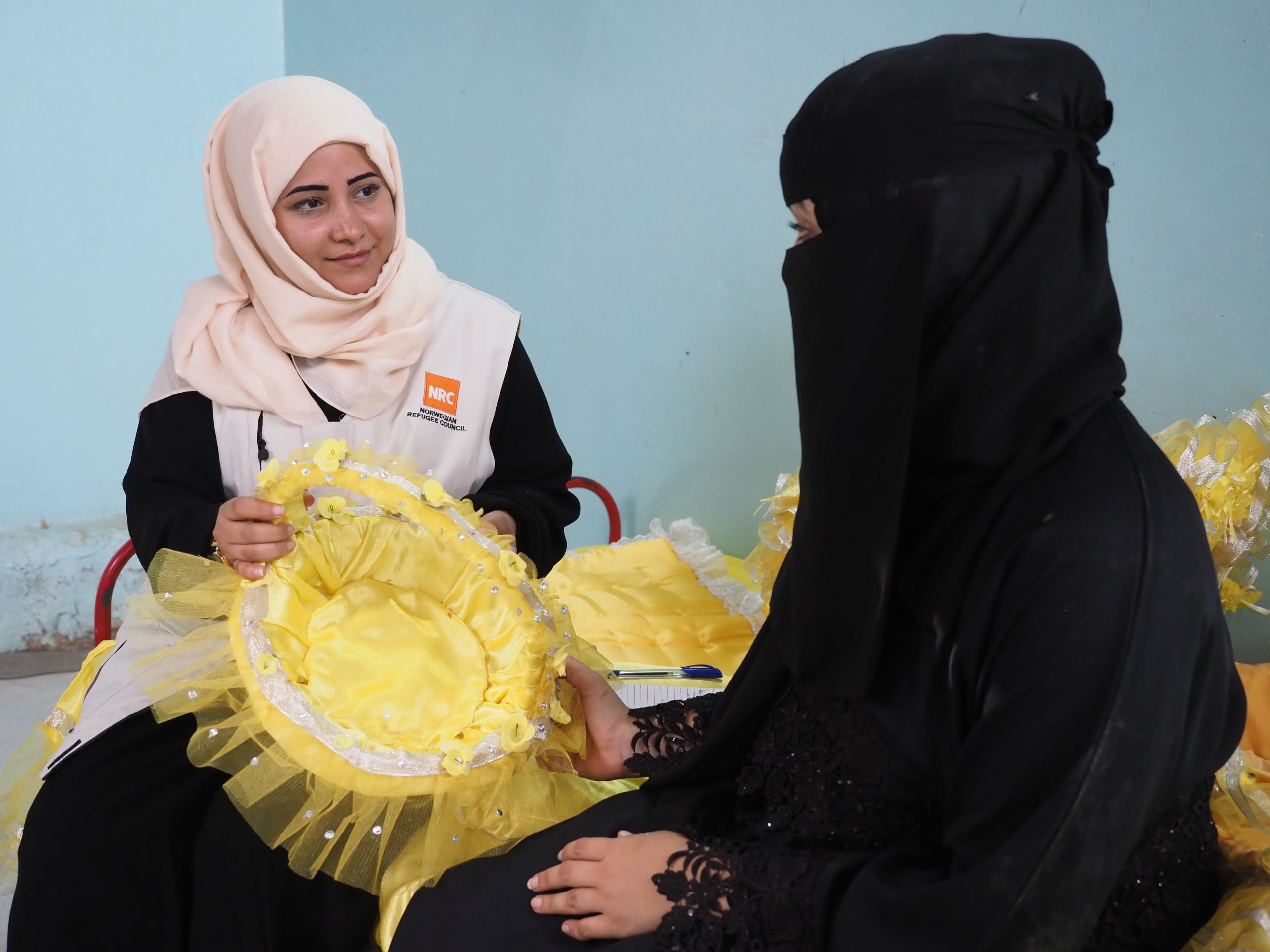Alham is now receiving support from NRC to develop her business making “baby packages” for new mothers. Here she shows NRC Protection Officer Abrar Najeeb one of her handmade products