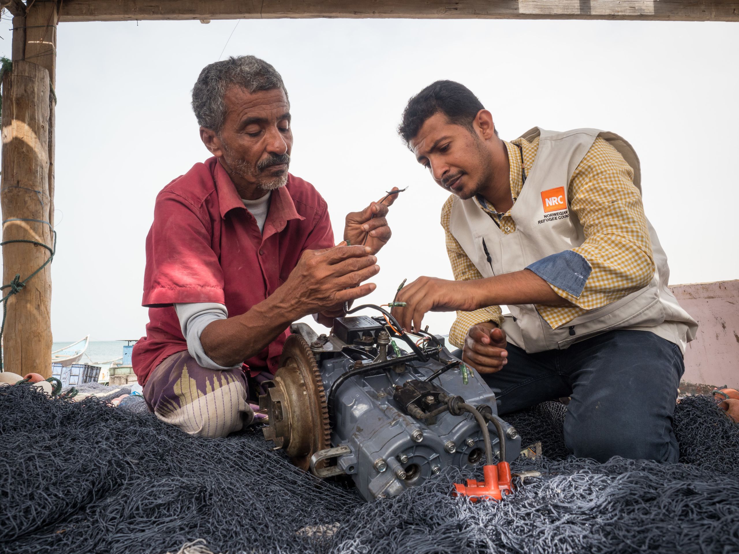 NRC Livelihood Officer Amr Al-Saqqaf explains about boat engine repair and maintenance to a local fisherman.
