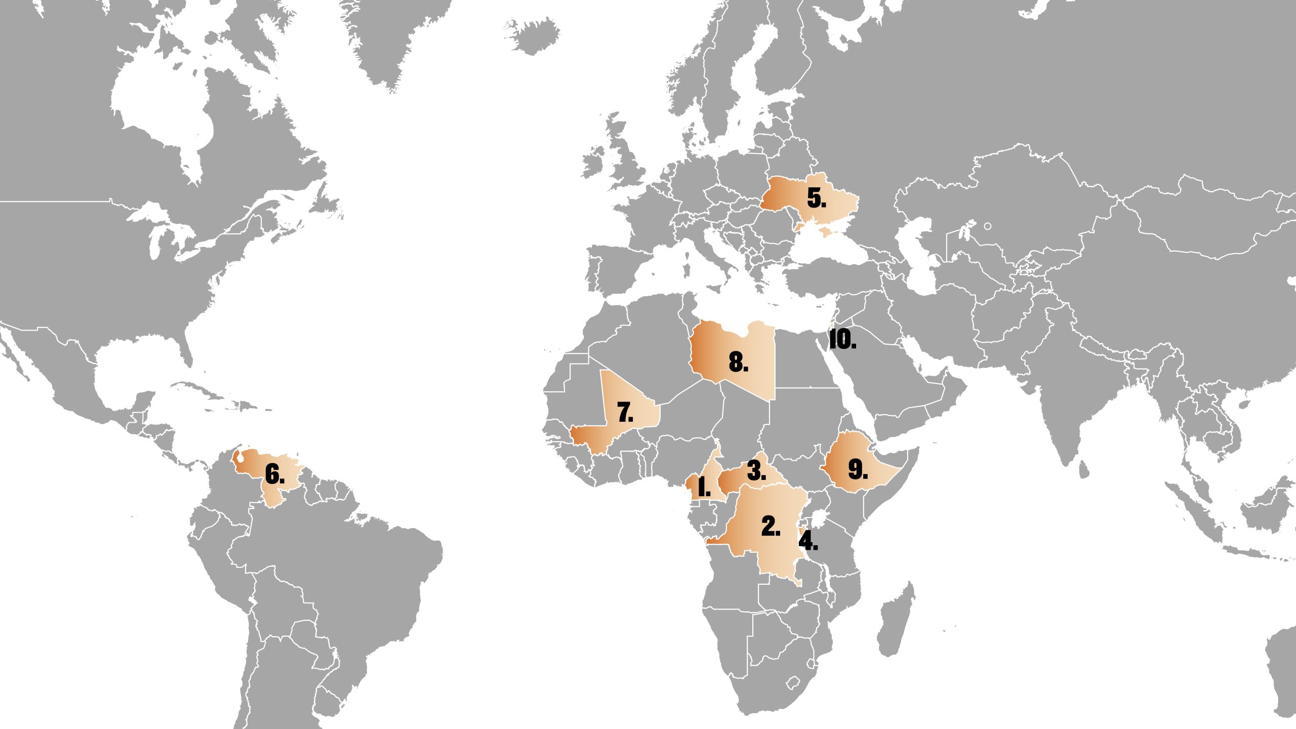 List of the most neglected displacement crises. 1. Cameroon 2. The Democratic Republic of the Congo 3. The Central African Republic 4. Burundi 5. Ukraine 6. Venezuela 7. Mali 8. Libya 9. Ethiopia 10. Palestine