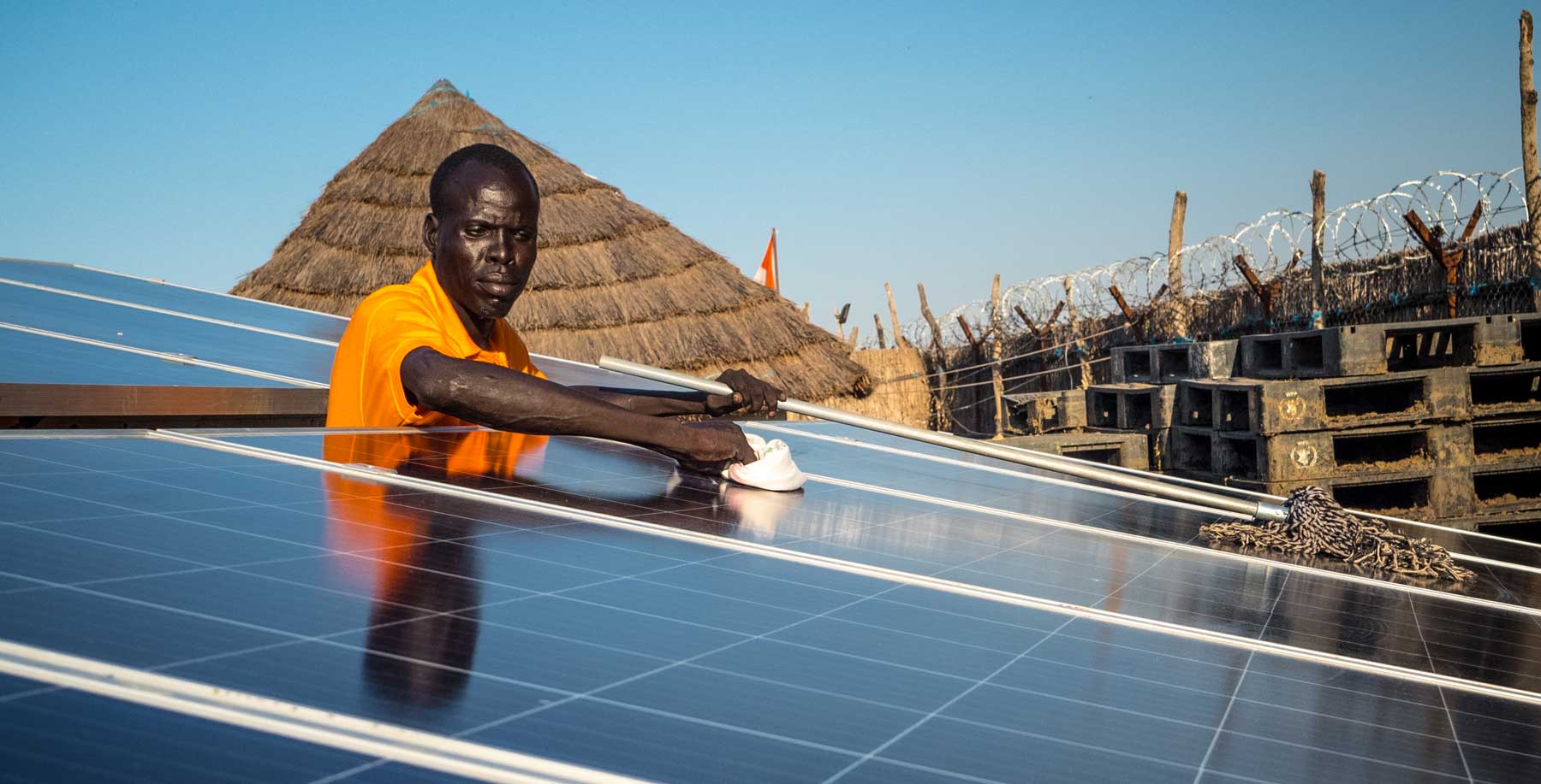 New solar panels being cleaned for optimal results by local volunteer Michael Gatluak at the Norwegian Refugee Council's office in Mankien, South Sudan. (Photo: Iban Colon/NORCAP)