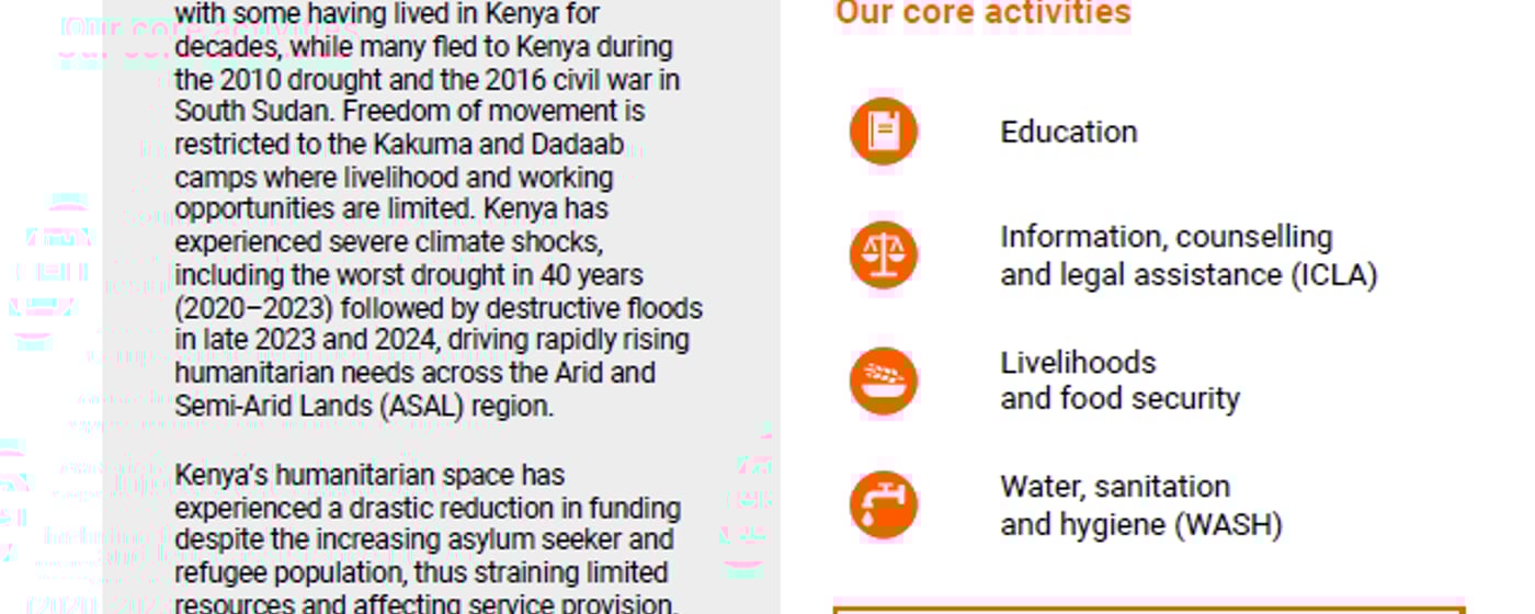 Freedom of movement is constrained in the camps and livelihood and working opportunities are limited. The country has experienced five consecutive below-average rainy seasons, causing the longest and most severe drought in recent history and driving rapidly rising humanitarian needs across the Arid and Semi-Arid Lands (ASAL) region. It also drove new displacement into Dadaab camp from Somalia, destroyed livelihoods assets and crippled purchasing power, driving up prices of basic commodities.