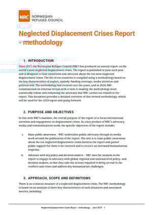 The list of ten countries is compiled using a methodology based on the key characteristics of neglect, namely: funding coverage, media attention and political will. The methodology has evolved over the years, and in 2024, NRC commissioned an external review with a view to making the methodology more statistically robust and enhancing the advocacy that NRC carries out related to the report.