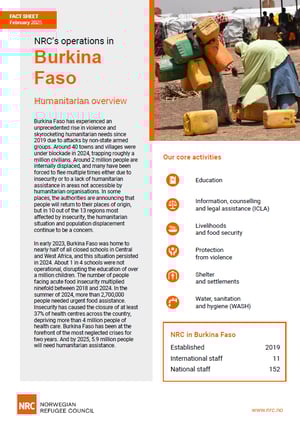 Facts and figures NRC Burkina Faso | Fact sheet Published 21. Feb 2024 l Burkina Faso Country fact sheet Burkina Faso has experienced an unprecedented rise in violence and skyrocketing humanitarian needs since 2019 due to attacks by non-state armed groups. Around 40 towns and villages were under blockade in 2024, trapping roughly a million civilians. Download factsheet (February 2025)
