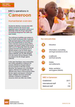 Facts and figures NRC Cameroon | Fact sheet l Cameroon Country fact sheet Despite the attention received when NRC named Cameroon the second most neglected crisis in the world in 2023, as of December 2024 only 45 per cent of the Humanitarian Response Plan (HRP) had been funded. Download factsheet (February 2025)