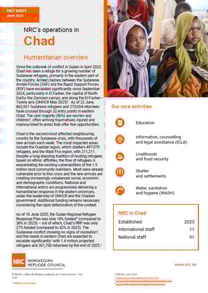 Facts and figures NRC Chad | Fact sheet Published 24. Feb 2025|Updated 04. Jul 2025 l Chad Country fact sheet Since the outbreak of conflict in Sudan in April 2023, Chad has been a refuge for a growing number of Sudanese refugees, primarily in the eastern part of the country. Download factsheet (June 2025)