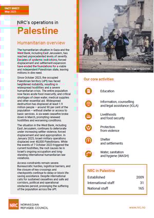 The Norwegian Refugee Council (NRC) aims to to contribute to the survival, protection and dignity of people affected by conflict and displacement in Gaza and the West Bank, including East Jerusalem. We respond to emergencies following violence and forcible transfer, and address long-term displacement by promoting self-reliance through impactful programming and sustained advocacy.