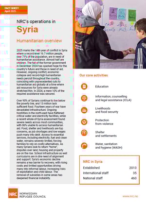 Facts and figures NRC Syria | Fact sheet l Syria Country fact sheet The Norwegian Refugee Council (NRC) is one of only a few agencies operating across all of Syria. Against a backdrop of intense conflict, we work to provide emergency, transitional and longer-term assistance to people in need. Download fact sheet (April 2025)