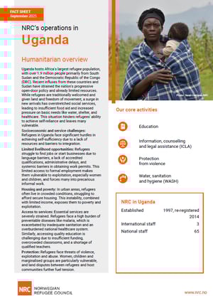 Facts and figures NRC Uganda | Fact sheet l Uganda Country fact sheet Uganda hosts over 1.9 million refugees and asylum seekers. The Norwegian Refugee Council (NRC) gives both life-saving and long-term support to refugees from Sudan, South Sudan, DR Congo and Burundi. Download fact sheet (September 2025)