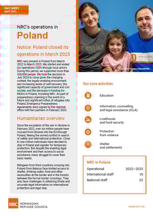 Facts and figures NRC Poland | Fact sheet l Poland Country fact sheet NRC was present in Poland from March 2022 to March 2025. We started and ended our operations 100 per cent through local actors. During this period, we supported more than 330,000 people. Download the fact sheet (April 2025)
