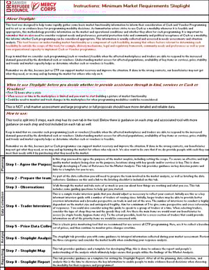 The Stoplight tool, revised by the Norwegian Refugee Council (NRC) and originally designed by the Danish Refugee Council (DRC) and Mercy Corps, is tailored for short-term interventions of six months or less. It is less comprehensive than the Multi-Sector Market Assessment (MSMA), allowing for a complete market analysis in just one week. This makes it ideal for emergency responses, supporting the first line of crisis response.